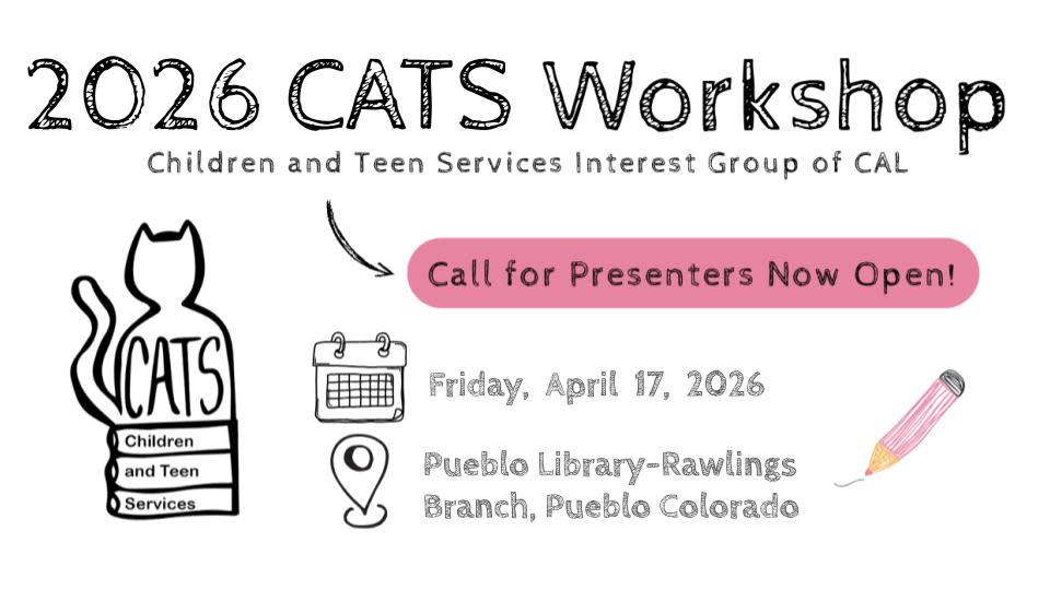 The Children and Teen Services (CATS) Interest Group hosts an annual Winter Workshop to provide a forum for all library staff who serve children and teens. Share ideas while working together to fill the need of consistently providing excellent services to patrons from birth to 18 and their caregivers throughout the state of Colorado.